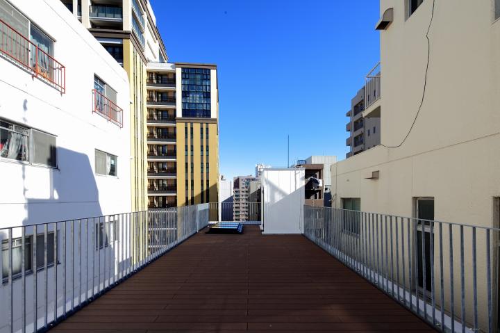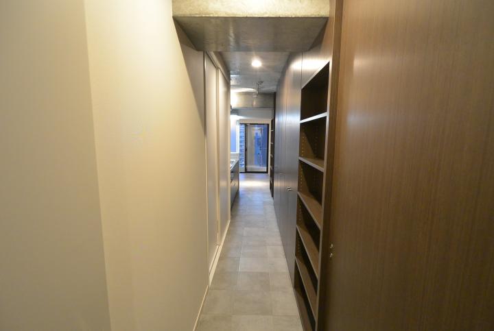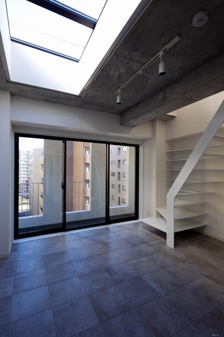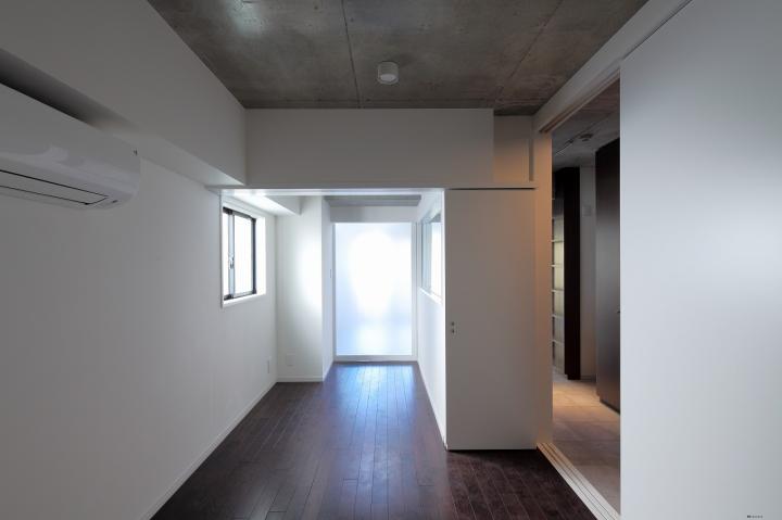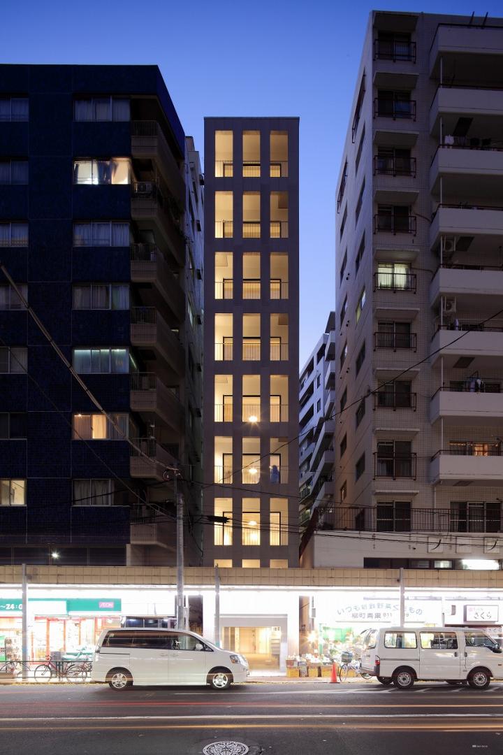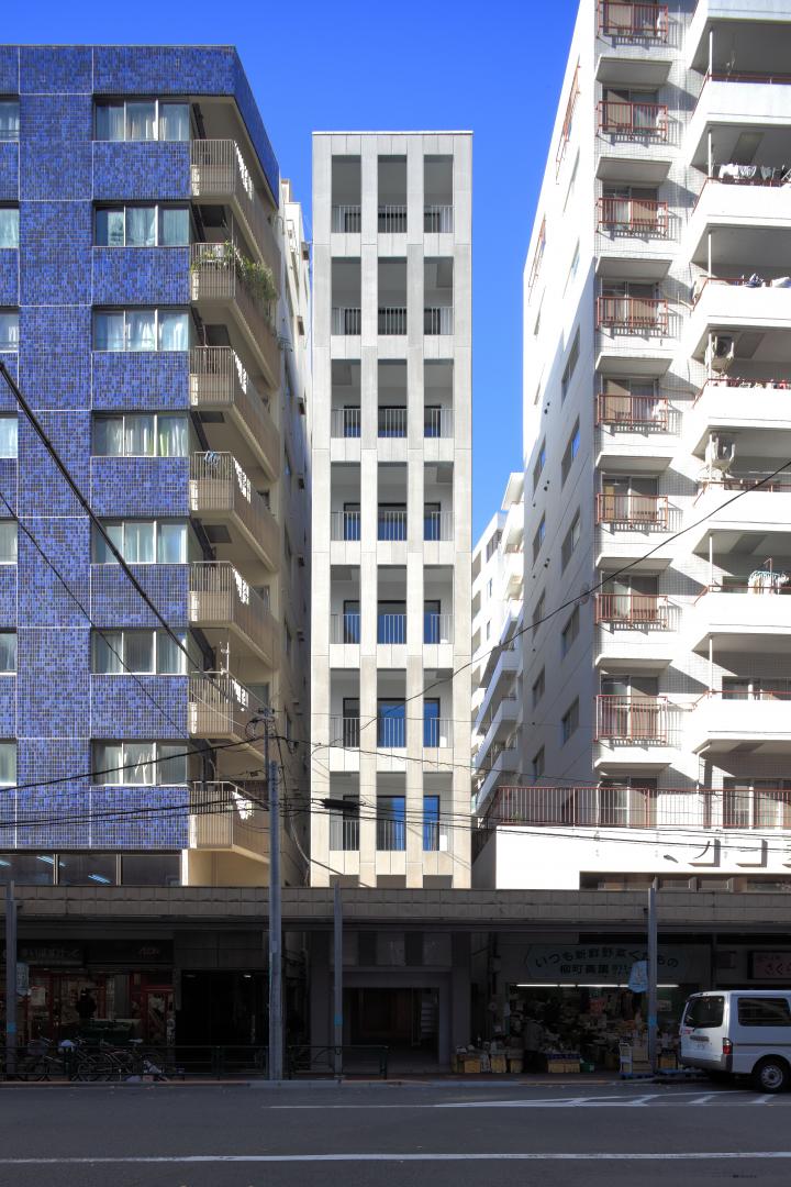 地上9階建ての集合住宅です。 この建物の特徴は、立地する敷地の間口5mという狭さにあります。 建築の容積を最大に計画したことで生じる、細長いプロポーションのファサードに、比率を揃えた開口をあけ、スケールの大きな格子窓のようにデザインすることで、奥行きのある表情を建物の内外の間に持たせることができました。また各住戸のプランは約13mの住戸内の奥行きを活かす工夫をしています。廊下はタイル敷きの土間状空間とすることで、玄関から道路側のテラスまでが見通せる開放的な空間としています。収納やキッチンは部屋内に設けず、この廊下に面して設けることで、各部屋をNLDの概念にとらわれない自由な構成としています。
